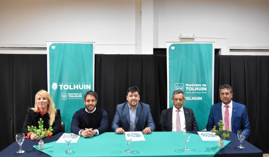 El acuerdo fue firmado por el Intendente de Tolhuin, Daniel Harrington; el Presidente del Banco de Tierra del Fuego, Dr. Fabián Eduardo Musso; y el Presidente del Colegio de Escribanos, Dr. Lautaro de la Riva Moscoso.