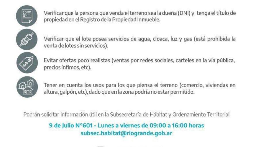 - Verificar que la persona que le venda el terreno tenga el título de propiedad a su nombre inscripto en el Registro de la Propiedad Inmueble (Moyano N.° 780) y que los datos sean los que correspondan al terreno (siempre solicitar número de partida inmobiliaria).