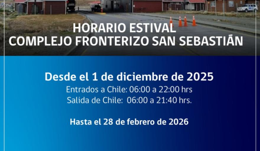 A través de un comunicado, la delegación provincial de Tierra del Fuego de Chile informó que a partir del 1° de diciembre de este año, el Complejo Fronterizo San Sebastián, cambia su horario.